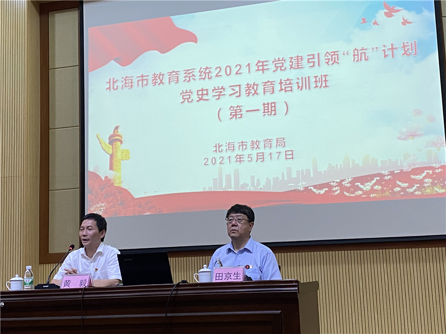 5月17日上午,由北海市教育局主办的北海市教育系统2021年党建引领“航”计划——北海市党史学习教育培训班在北海外国语实验学校多功能报告厅开班。本次培训邀请中国教育学会学术委员、北京师范大学基础教育研究员、原北海市人民政府教育顾问、原北京市西城区教委主任田京生教授主讲,市教育工委副书记黄毅主持。学校组织党务干部代表参加培训。