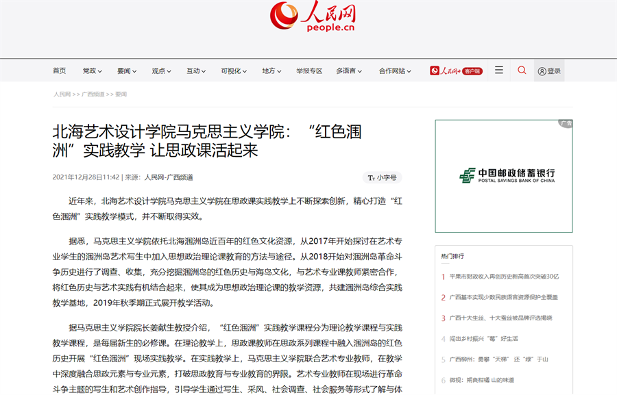 12月28日,人民网以《北海艺术设计学院马克思主义学院:“红色涠洲”实践教学 让思政课活起来》,关注报道了我校马克思主义学院在思政课实践教学上的探索创新实绩,即挖掘北海涠洲岛近百年红色文化资源而精心打造的“红色涠洲”实践教学成果。