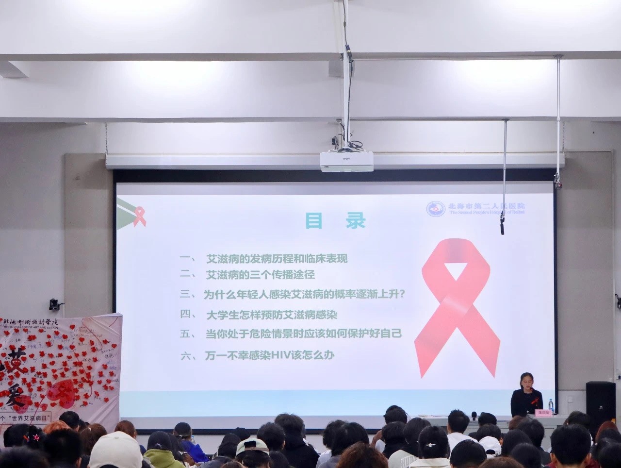 为进一步加大防艾宣传力度,提升我校师生对艾滋病的认识和防护,2024年11月29日,我校于西区公德楼107开展“青春有爱·健康无艾”的性与生殖健康、女性生理健康、防艾禁毒主题讲座。为此特邀北海市科学传播医疗卫生专家,北海市第二人民医院的潘润洁老师围绕主题“社会共治,终结艾滋,共享健康”探讨艾滋病相关知识与防治要点。