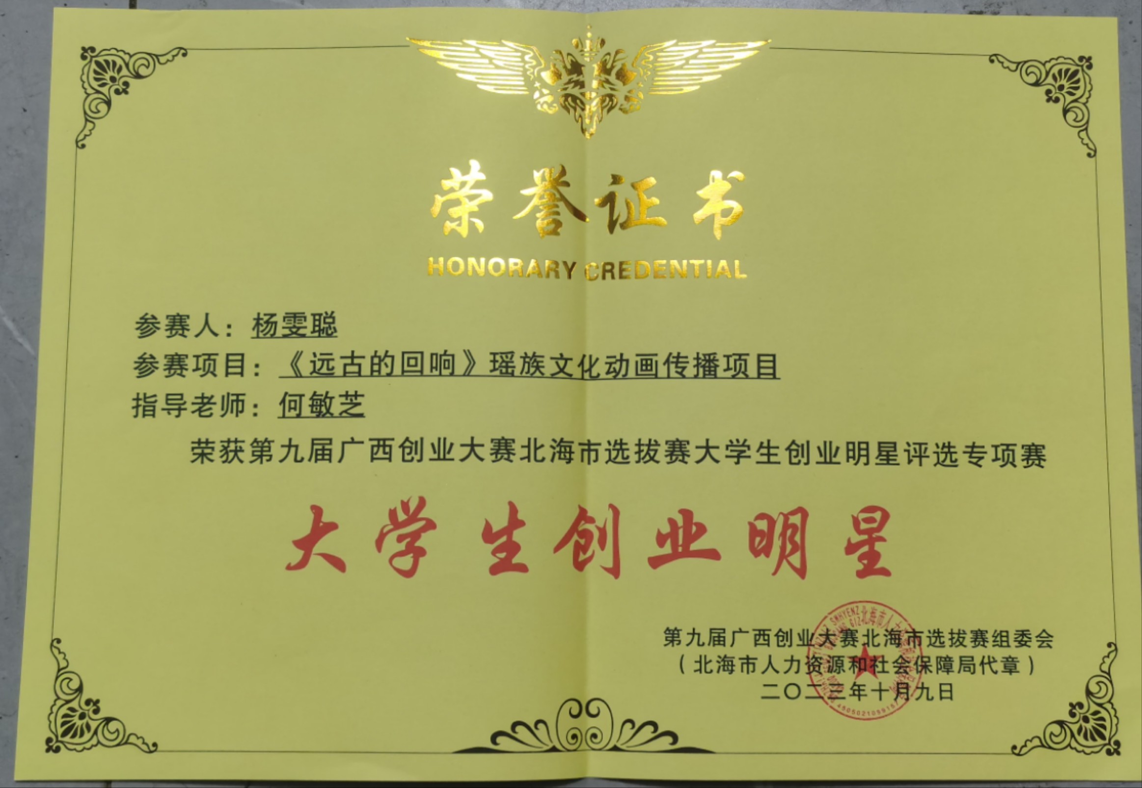 第九届中国国际互联网+大学生创新创业大赛“数广集团杯”广西赛区选拔赛获奖证书