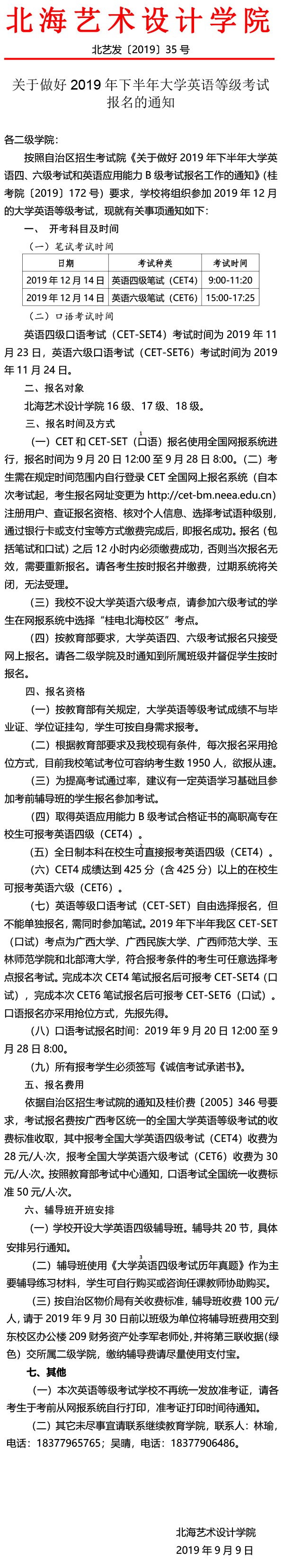 关于做好2019年下半年大学英语等级考试报名的通知