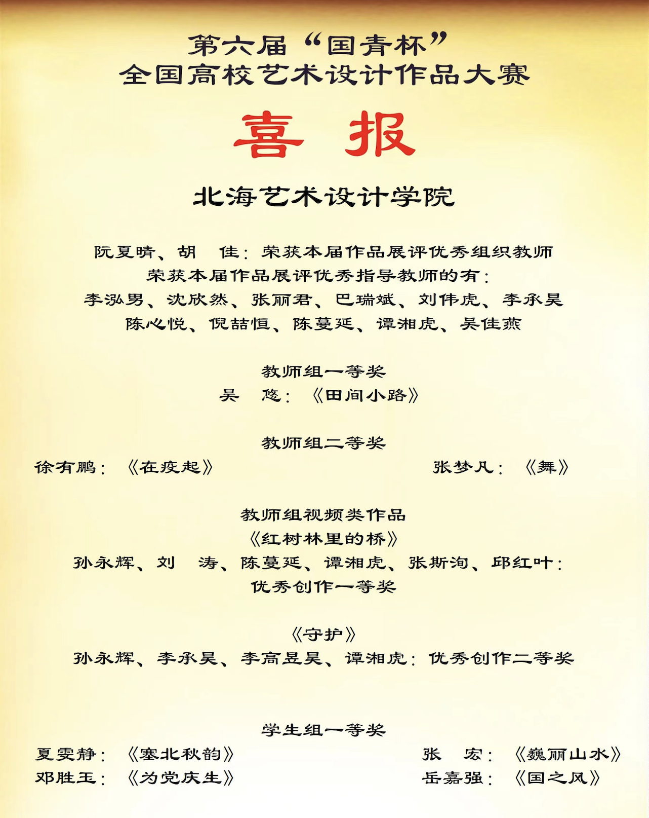 喜报,2022年12月第六届“国青杯”全国高校艺术设计作品大赛,数字媒体艺术学生,岳嘉强作品《国之风》获得学生组一等奖,缪怡轩《乐下谣》获得学生组二等奖,阙千骑作品《山居图》获得学生组二等奖,陈琦作品《中共二十大报告摘选》获得学生组三等奖,韦华作品《国韵古风》获得学生组三等奖,叶常凯作品《圆梦七巧板》获得学生组三等奖,刘宇昕,张智涵,凌可、施兴亮,任芸娴,刘骐瑞,李福年,王建龙,付若彤作品《红树林里的桥》获得优秀创作一等奖。刘宇昕、任芸娴,凌可、张智涵,付若彤、刘骐瑞,李福年、赵晨希,王建龙、宙卓,施兴亮、高薇淇作品《向海》获得优秀创作二等奖,周渺杉,林祥杰,黄恭康,龙江龙,周雅云,肖卓豪作品《党的一百年》获得优秀创作三等奖。