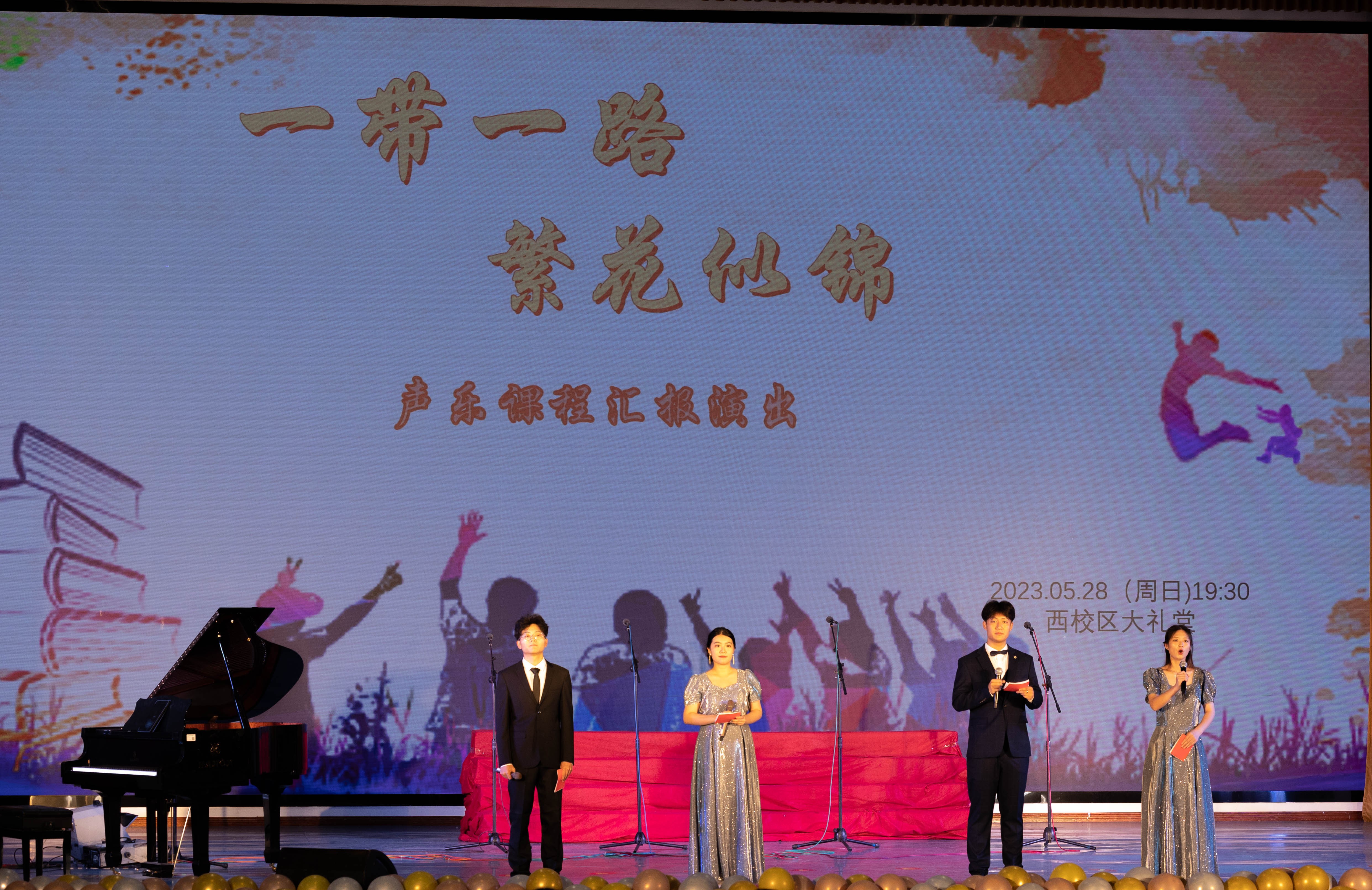 青春启航,奔赴星辰。2023年5月28日,学院艺术教育专业声乐课程汇报演出在西校区大礼堂成功举办。学校党委委员刘承初、学院副院长李水亮、李谦。艺术教育、学前教育专业师生应邀出席。本次汇报演出由学院艺术教育教研室承办,艺术教育专业2020、2021级音乐班全体学生参演。整场演出凸显“一带一路,繁花似锦”主题,以学生为主、老师为辅,通过师生默契合作,歌声悠悠,青春浪漫,为现场来宾奉上一场精彩绝伦的艺术盛宴,共同留下了一个美妙难忘的声乐记忆。