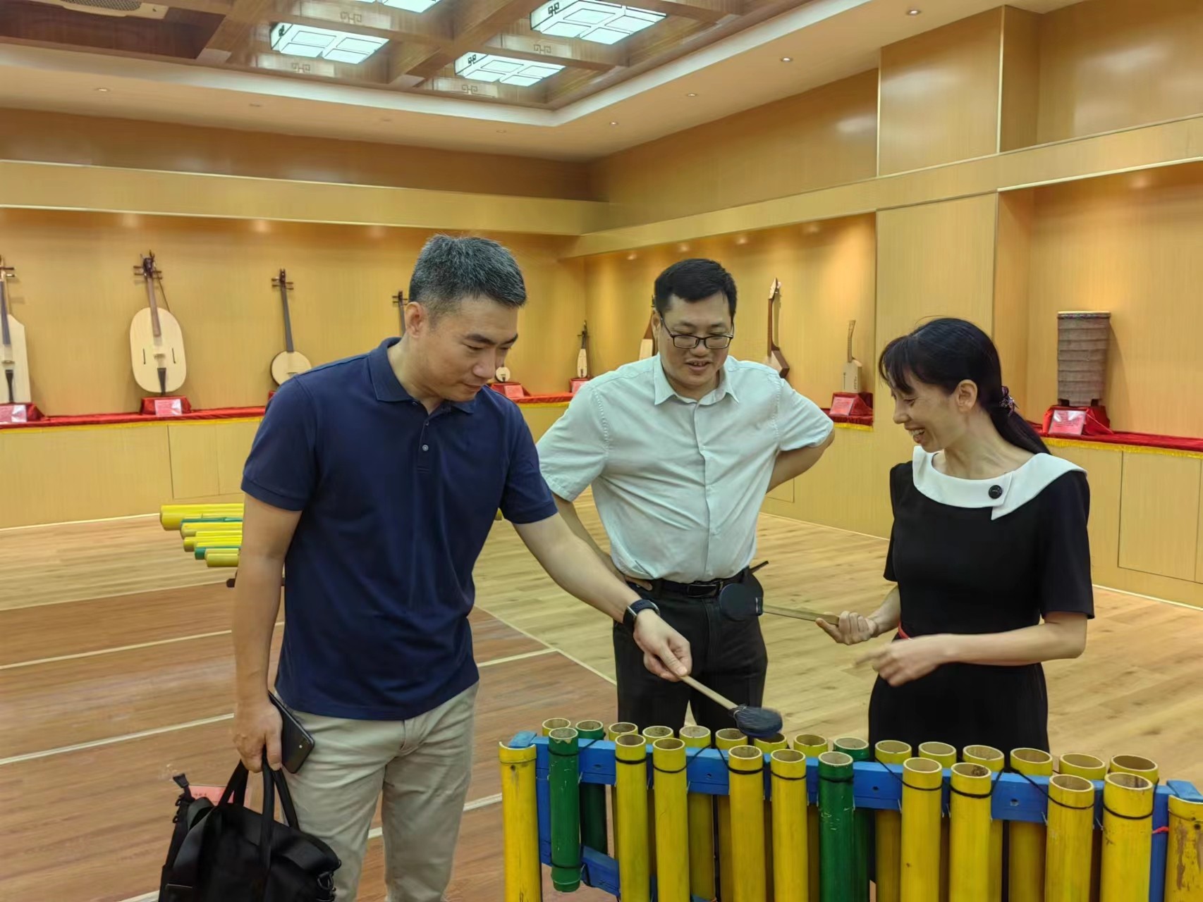 27日上午,在南宁师范大学音乐与舞蹈学院党委书记陈宇、院长黄妙秋的带领下,考察交流团一同参观了学院的音乐厅、报告厅、广西少数民族乐器研究中心展厅、琴房、录音棚、舞蹈教室等实训场地。在广西少数民族乐器研究中心展厅,黄妙秋院长亲自讲解了无孔笛、瑶笛、美骆琴、竹鼓等由音乐名师工作室传承、改良、创新的广西民族民间乐器,并邀请我院考察交流人员一同参与演奏体验。