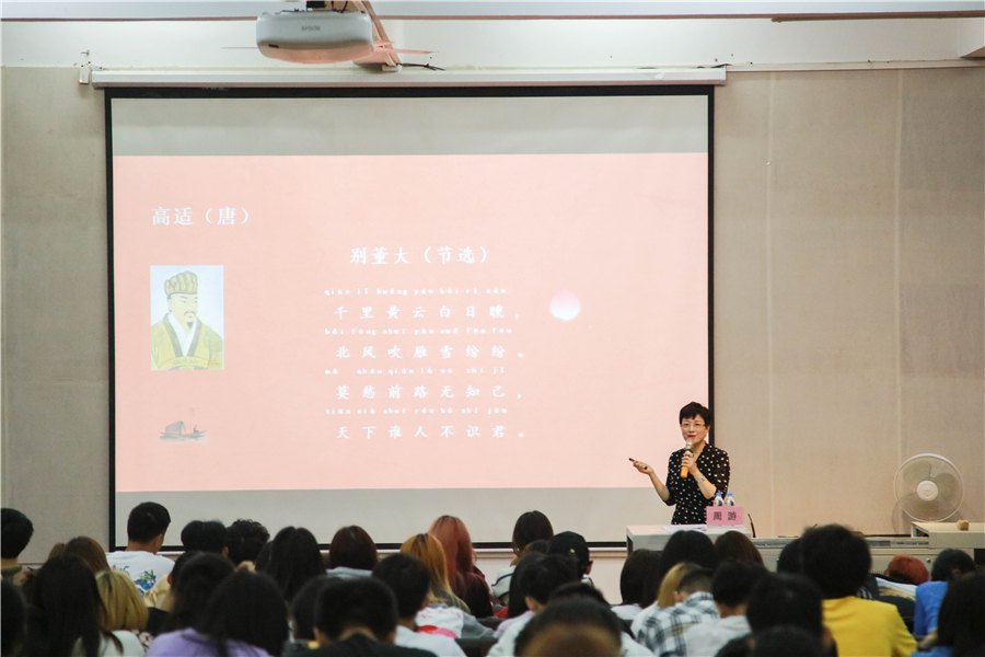 周游教授以边塞诗为例,讲述环境也是感情的一种表现,边塞诗人的爱国情怀值得赞颂,希望同学们尊重历史,将军魂、爱国之情融入心中,认真领悟诗魂,了解作品精神。以情发音。