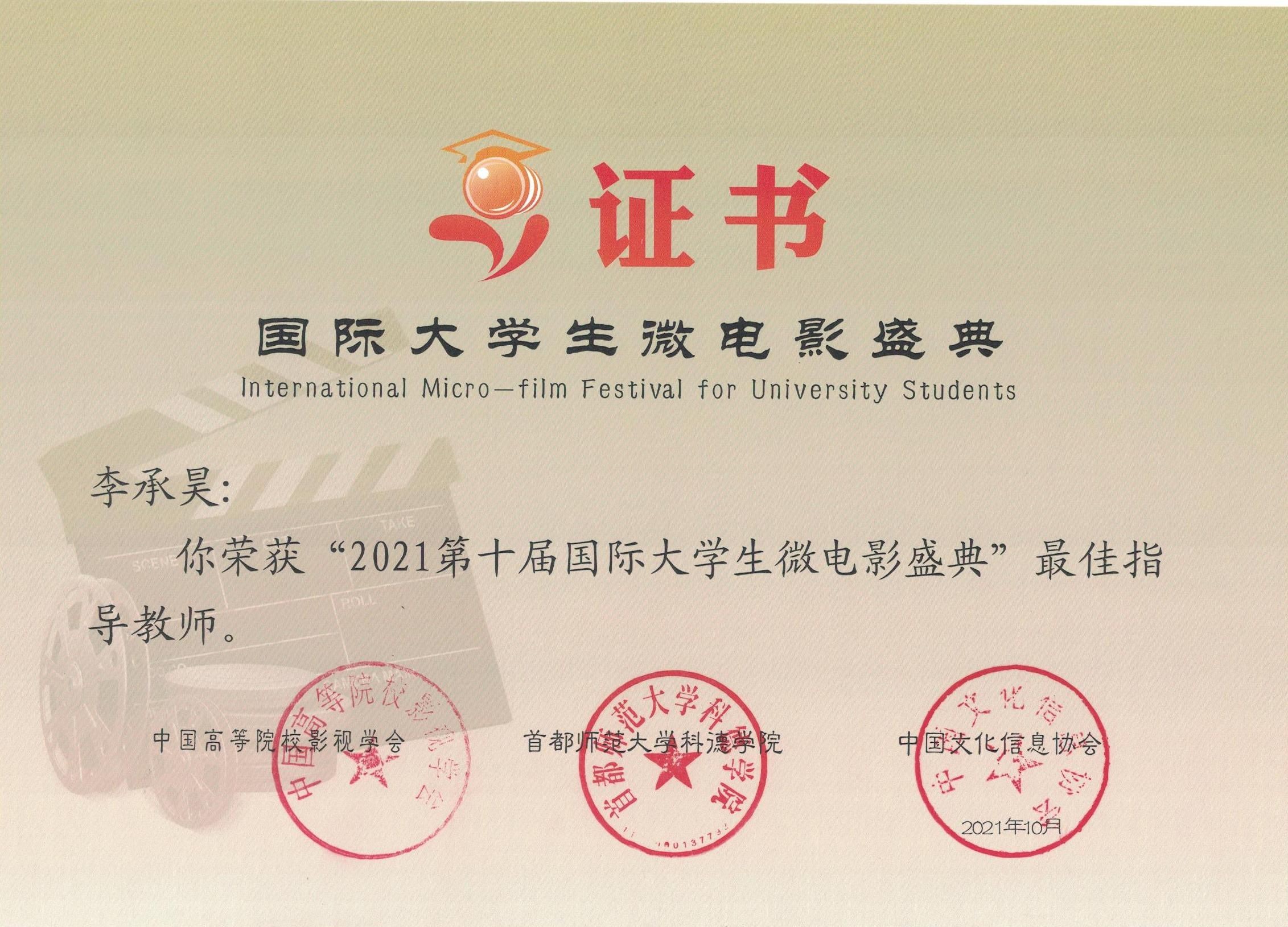 微电影《唱给海的歌》最佳指导教师奖证书