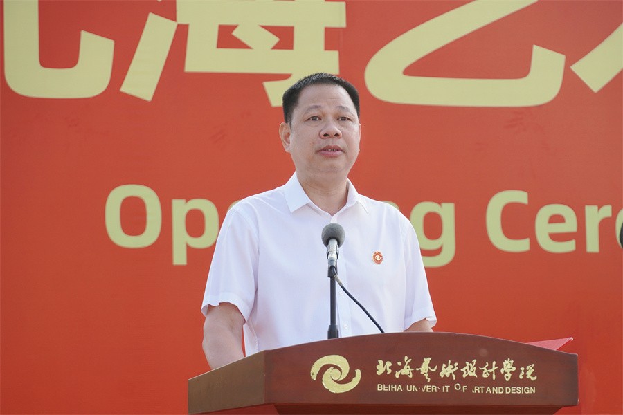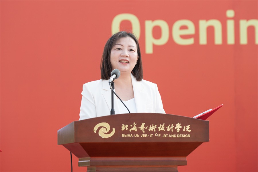 北海市人民政府副秘书长蒲笛春为此次开学典礼致辞,她表示北海市委市政府始终坚持为党育人、为国育才的初心使命,认真贯彻落实党和国家的教育方针政策,努力办好社会认可,人民满意的北海教育。北海环境优美,旅游资源得天独厚,近年来,北海向海图强,开放发展,经济社会发展不断取得新突破、新成效,北海教育事业蓬勃发展,北海总体发展一路向好的黄金时期和舒适宜人的生态环境,将会为同学们的成长、学习提供良好的环境。北海艺术设计学院经过24载的艰苦磨砺,已建设成为办学理念先进、办学特色鲜明、在北海市有着较高声誉和重要影响的特色高校,学校办学条件日渐完善,通过教育部本科教学工作合格评估,培养了一大批高素质应用型人才,为北海及周边社会经济发展作出了突出贡献。北海市委市政府将继续大力支持学校的发展。她希望广大青年学子志存高远,勇于创新,善于学习,用家国情怀点燃激情,用奋斗姿态激扬青春,立大志、明大德、成大才、担大任,努力成为堪当民族复兴重任的时代新人,不负党和国家的重托,不负历史和人民的期望,让青春在为祖国、为民族、为人民、为人类的不懈奋斗中绽放绚丽之花,为谱写新时代中国特色社会主义壮美广西北海篇章奉献光和热。