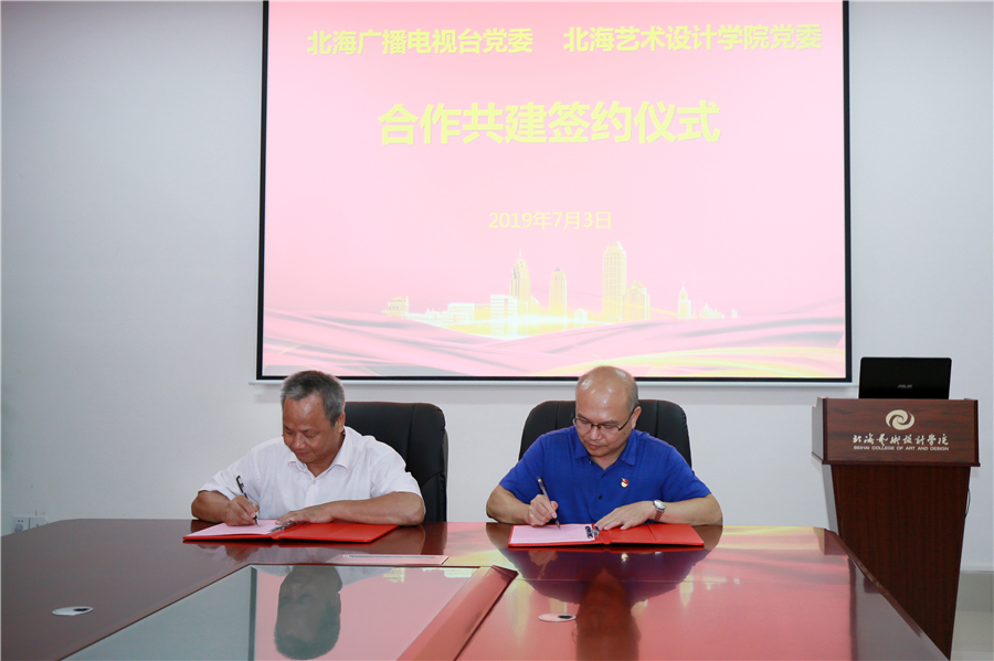 当天下午,北海广播电视台40多名党员,在高峰台长、唐立鹏、谢跃平、唐燕玲副台长的带领下,来到我校,他们首先参观了我校校园和师生美术作品、设计作品展览,观看了我校动画学院师生制作的动画片集锦,随后与我校的部分党员进行了座谈。座谈会后,我校党委书记李高南和北海广播电视台党委副书记、副台长唐立鹏作为双方代表签订党建合作共建协议书。