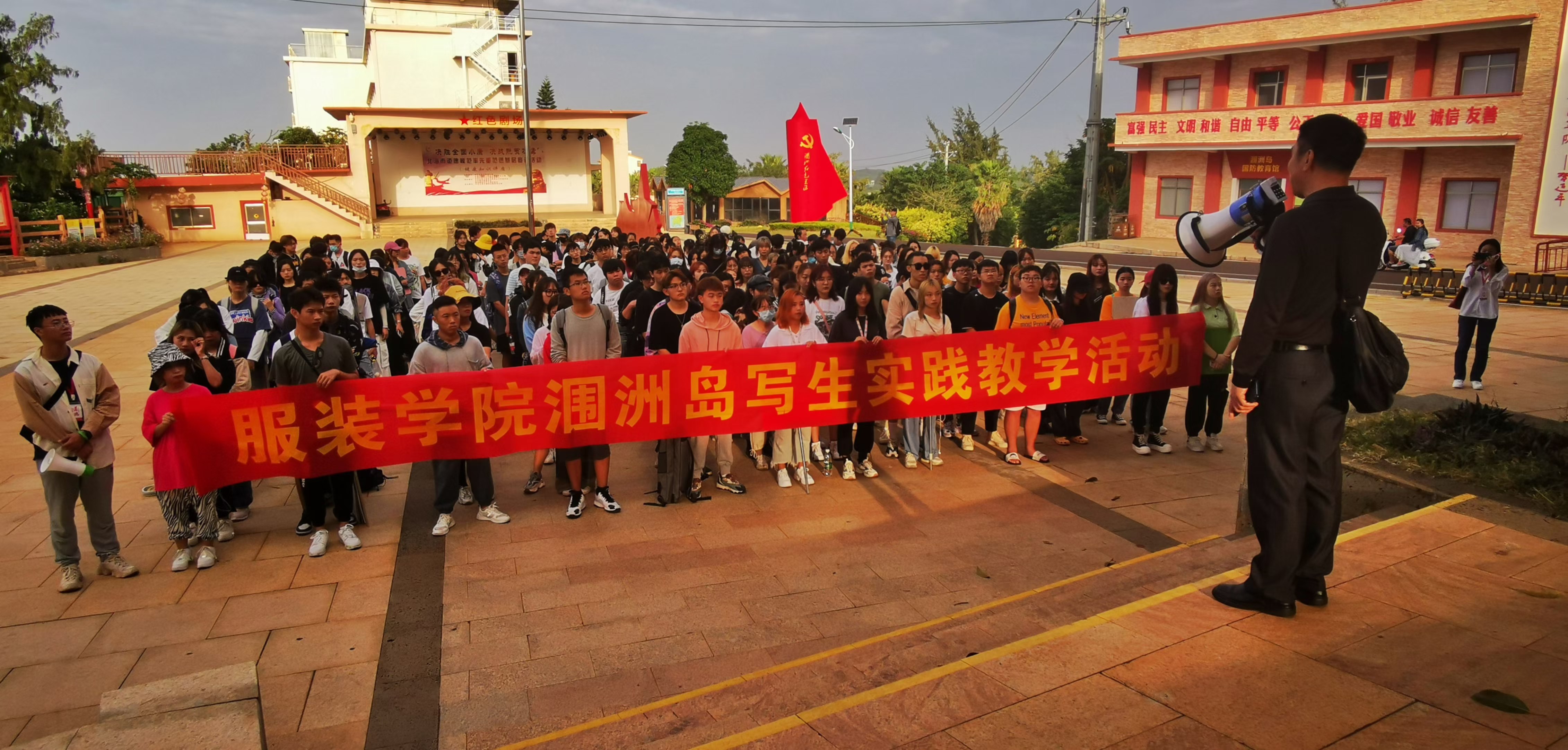 10月20日,思政部主任姜献生教授跟随第一批学生安全抵达涠洲岛,在学生写生过程中途经涠洲岛红色广场,向学生讲述了涠洲岛的革命斗争史,教育学生感恩先烈、珍惜当下,同时号召学生爱护岛上环境、友善待人,开展了生动的思政红色主题教育。