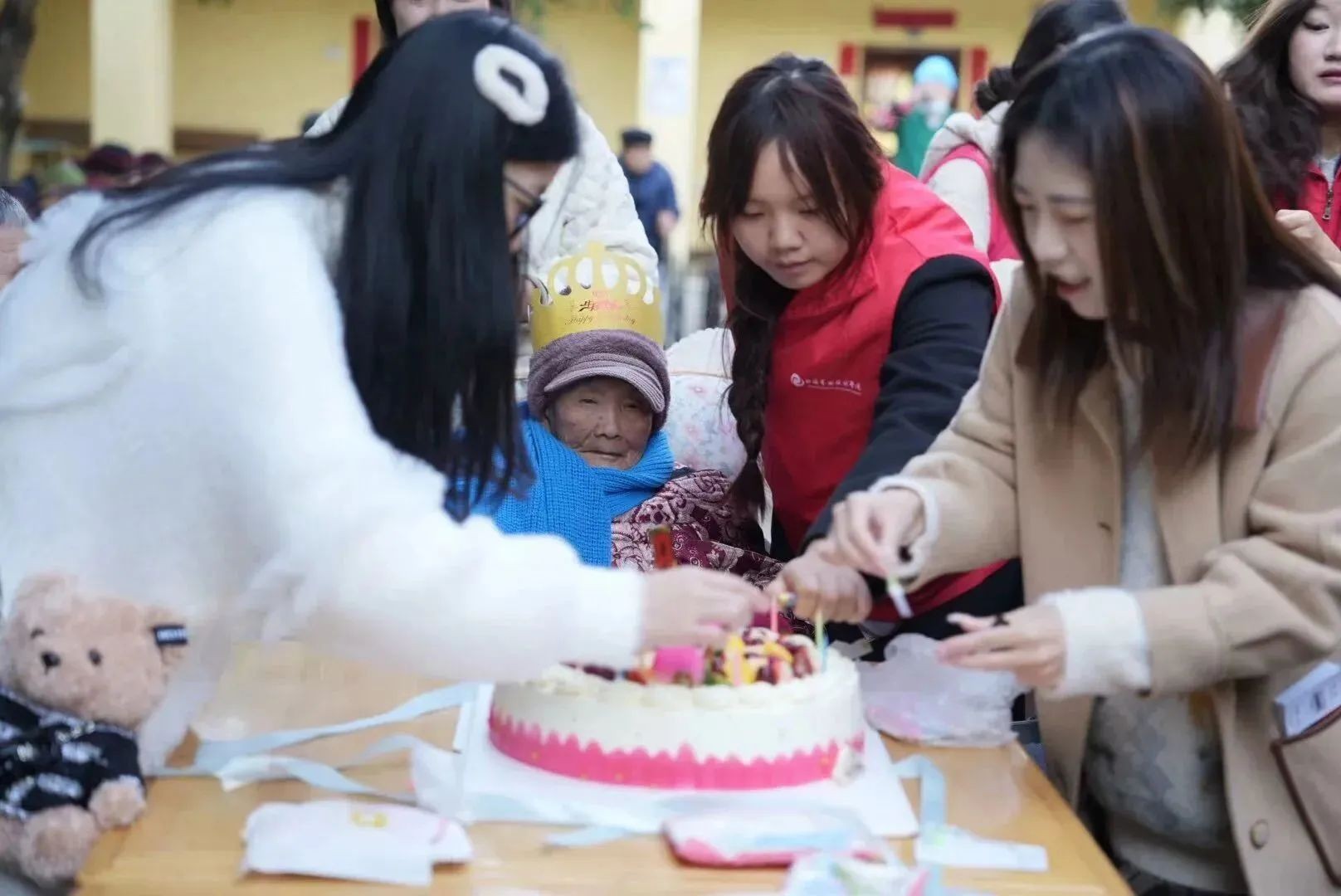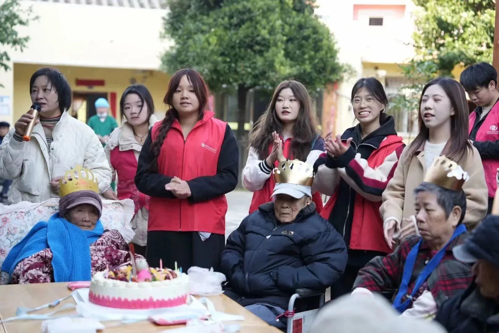 (志愿者为老人唱生日歌)