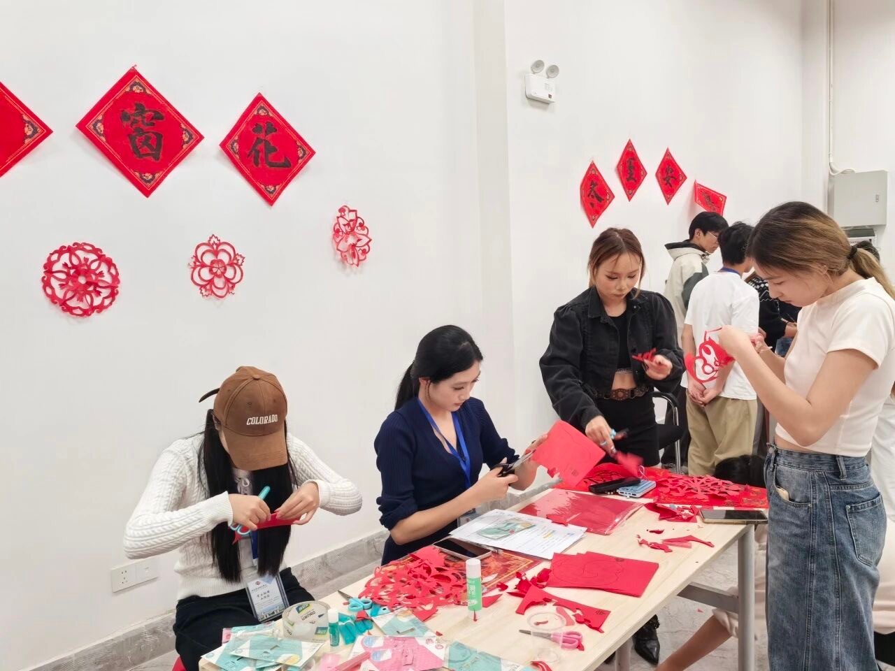 与此同时,传统文化体验活动同步开展。“写福字”区域内,师生挥毫泼墨,以笔墨寄情,一幅幅饱含祝福的福字承载着对新年的美好期许;“剪窗花”区域里,大家巧手翻飞,一张张红色纸张在指尖化作形态各异的吉祥图案,充分展现了民间传统艺术的生动魅力。现场特设的“转福轮”民俗知识问答环节,创新融合传统文化与现代互动形式,让师生在轻松愉悦的氛围中进一步深化对冬至民俗文化及各民族传统知识的认知与理解。