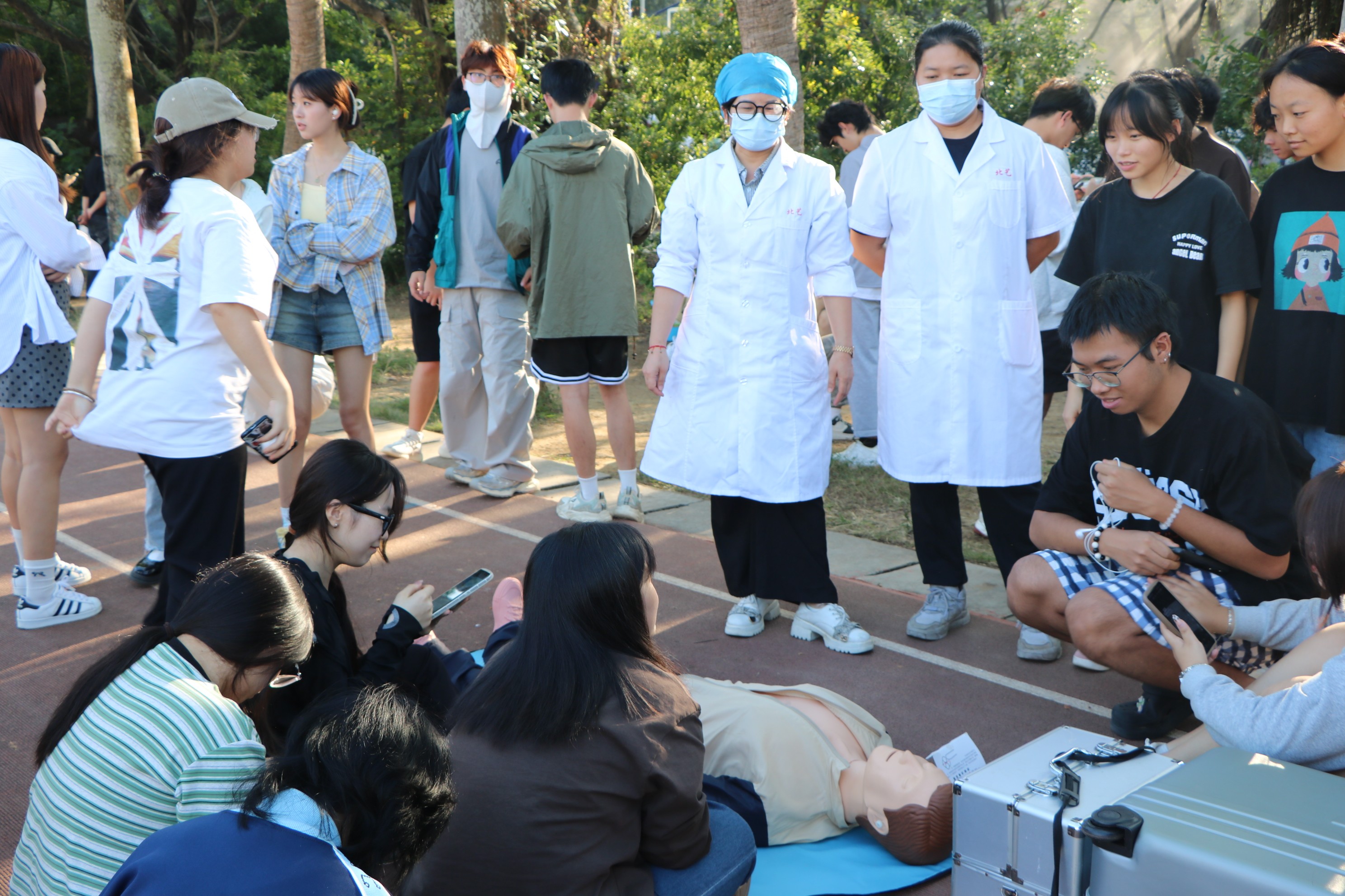还实操作演练灭火器灭火、穿越烟道模拟火场烟道充帐篷、穿戴过滤式呼吸自救器、心肺复苏三个部分内容。