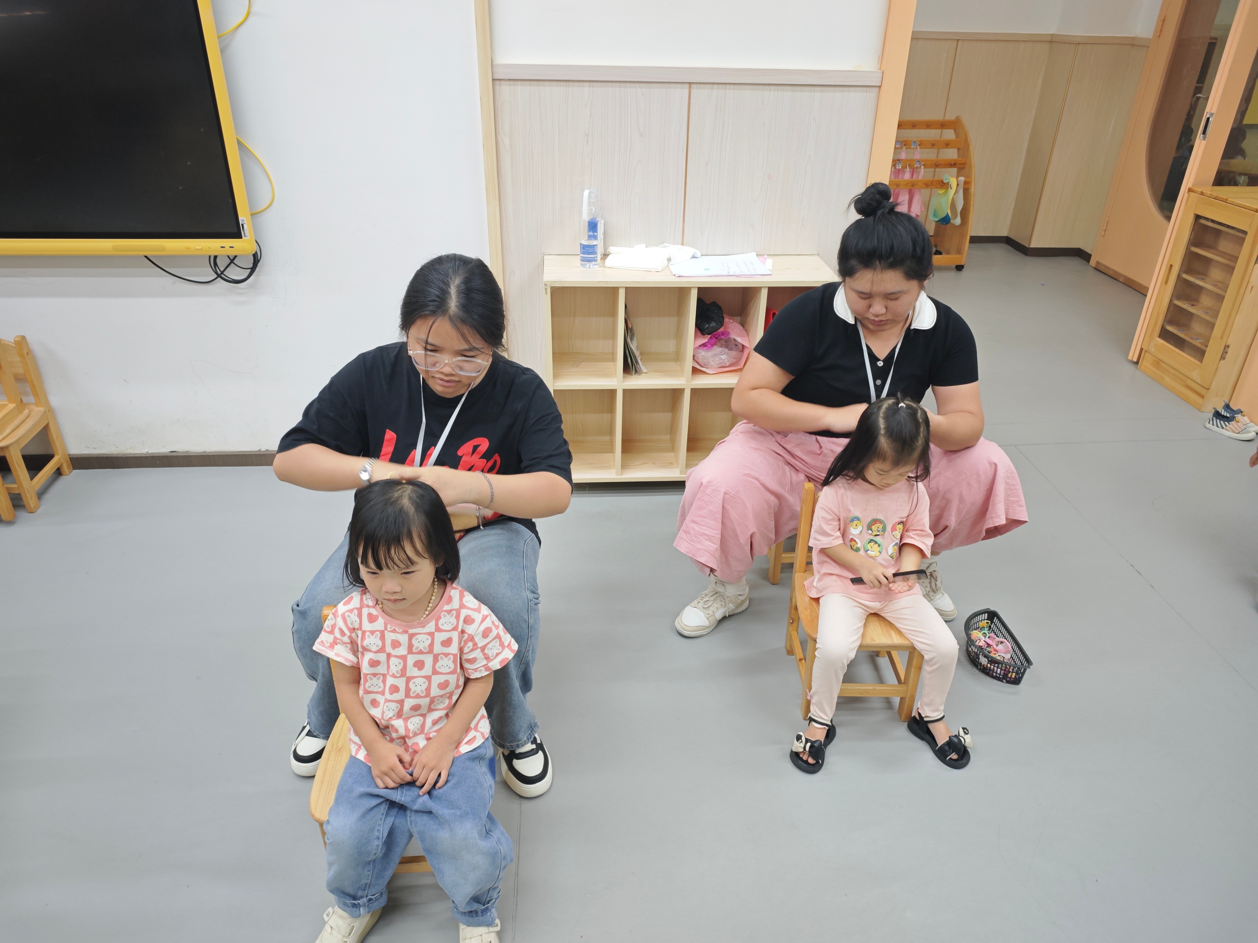 学前2401陈雅萱(左)陈婷婷(右)给幼儿扎头发