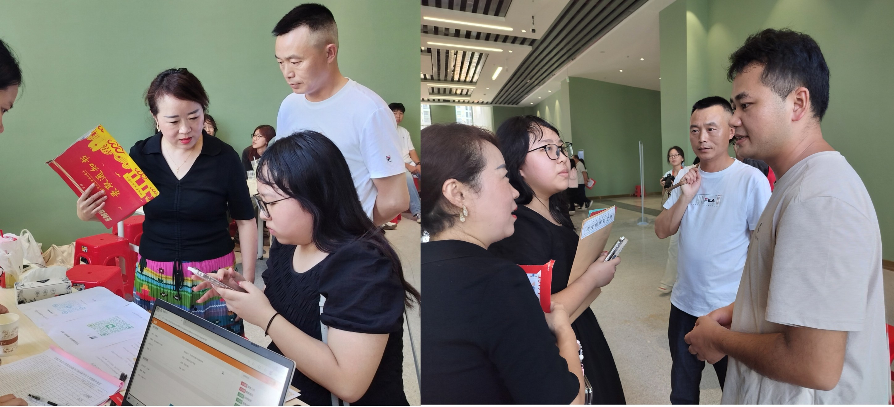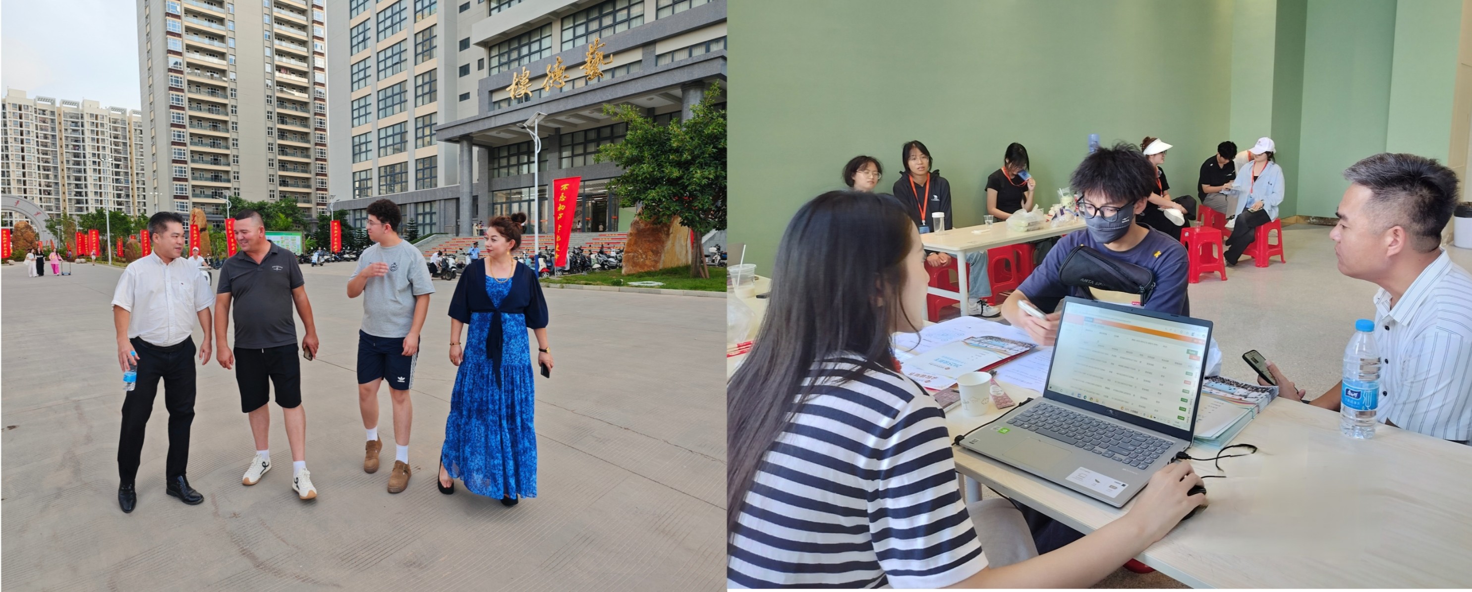 图一:学院李水亮常务副院长(左一)与学生家长交流 图二:学院老师为新生办理入学报到