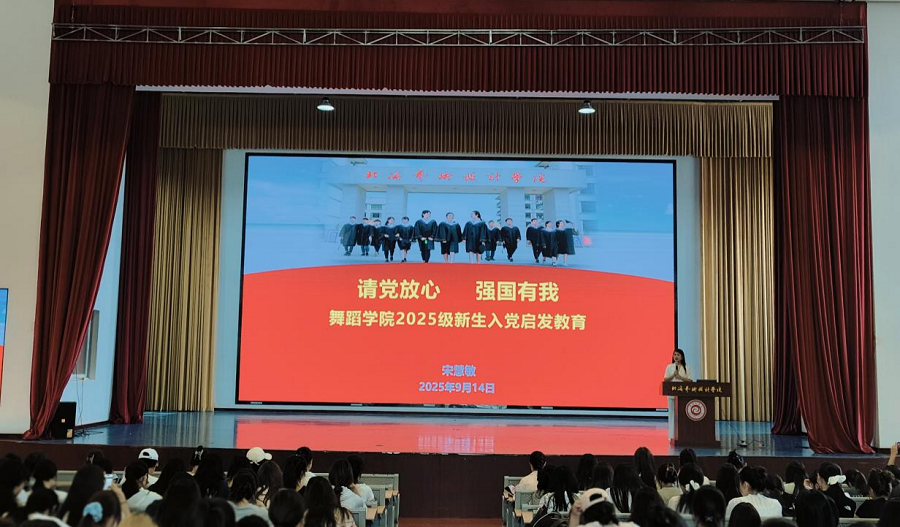 为加强学院新生对党的认识,激发全体新生对党的信仰和追求,引导广大青年学生听党话、跟党走,舞蹈学院党支部于2025年9月14日在学校大礼堂举办了2025级新生入党启发教育专题党课。此次党课由舞蹈学院党支部书记宋慧敏主讲,舞蹈学院常务副院长邓欢、副院长李谦与全体新生及辅导员一同参加。