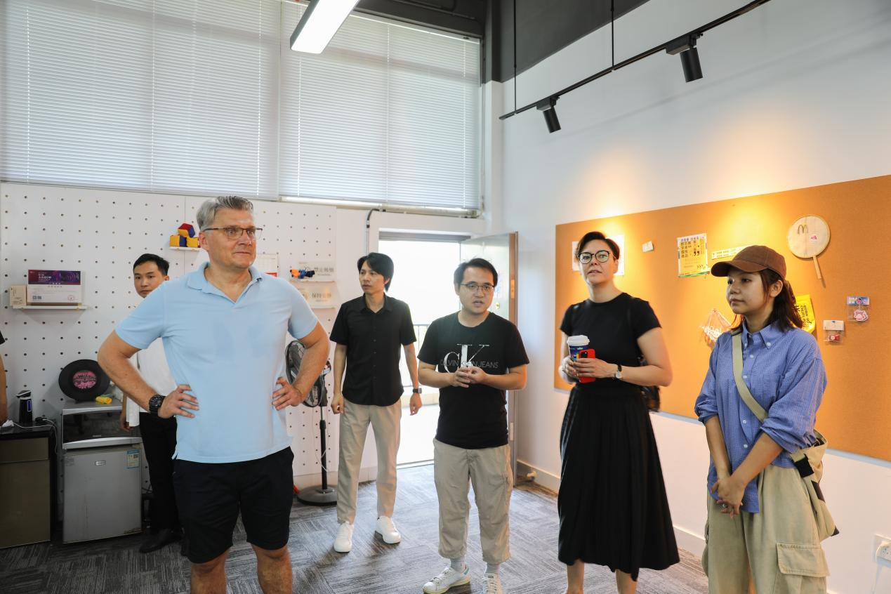 参观结束后,双方在动画与传媒学院综合楼前合影留念。Norbert教授表示,此次访问让他对我校动画与传媒学院有了更深入的了解,也让他看到了两校在动画与数字媒体教育领域合作的巨大潜力。他期待未来能够有更多的合作,促进跨文化交流。
