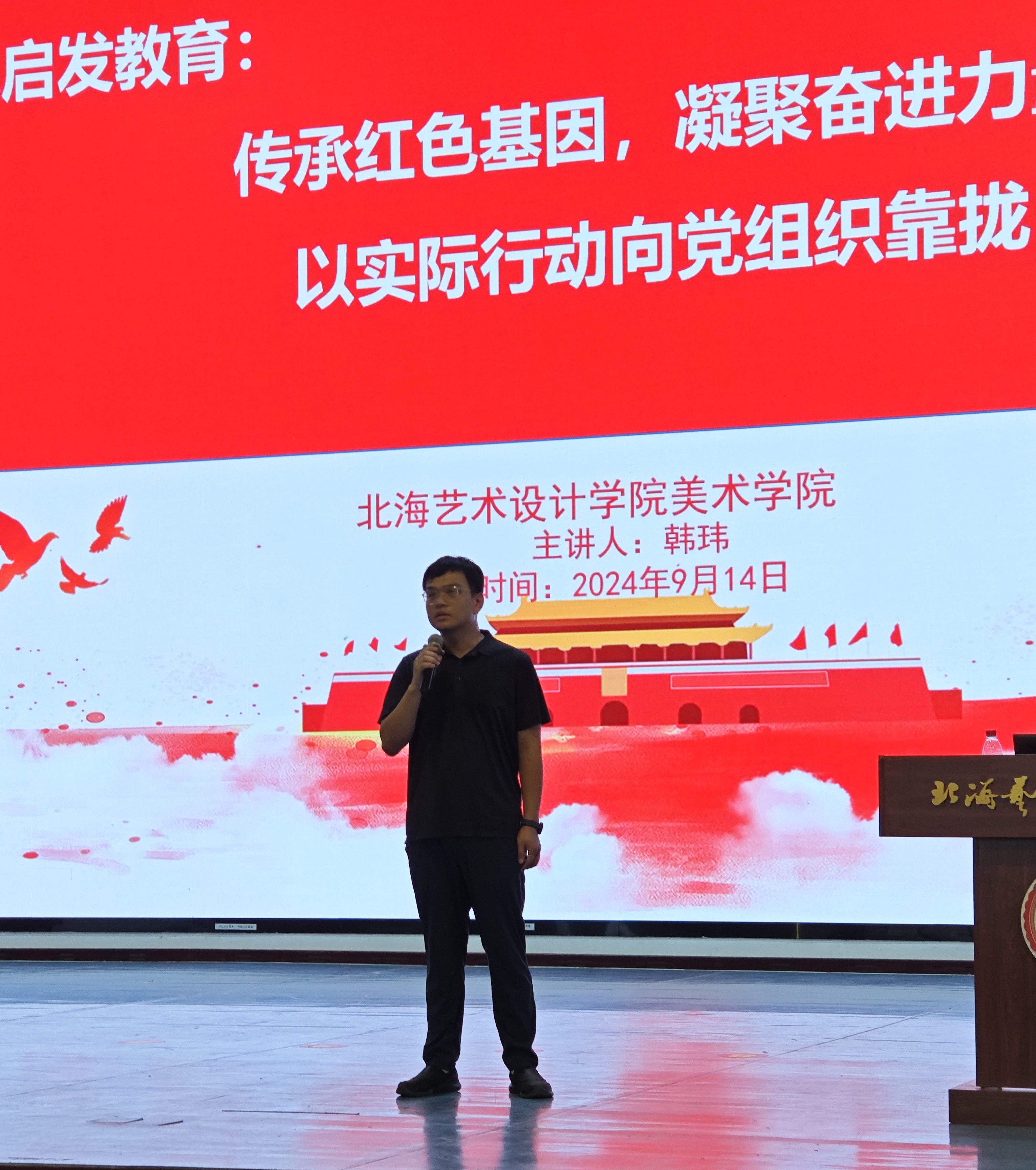 2024年9月14日下午15时,为深入学习贯彻习近平新时代中国特色社会主义思想,全面落实新时代党的建设总要求和新时代党的组织路线,美术学院党总支书记韩玮同志在学校大礼堂为美术学院2024级新生开展了一次意义深远的入党启发教育。