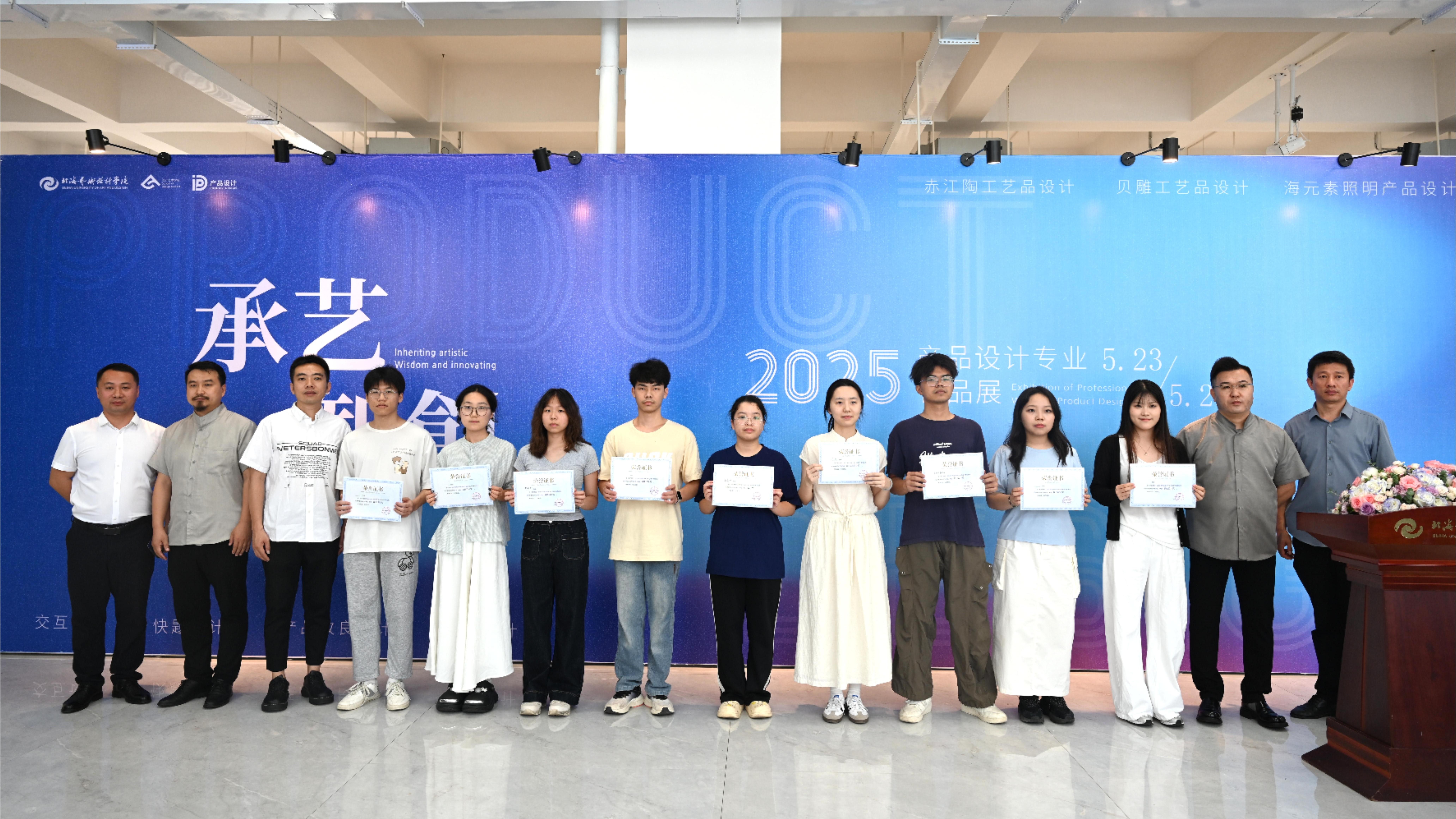 “承艺·智创”产品设计专业教学成果汇报展上,经评委会评选,12名学生斩获“最佳设计奖”,7名学生得系部LOGO设计“最佳创意奖”。出席的领导与教师为获奖学生颁发荣誉证书。