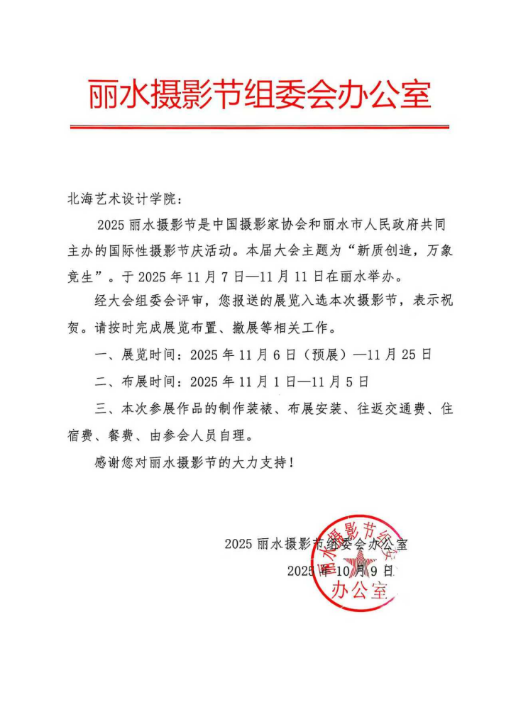 2025年11月4日,北海艺术设计学院美术学院摄影专业2022级、2023级、2024级合计22名学生,携29幅摄影作品随美术学院副院长李炫勋来到浙江省丽水市古堰画乡艺术中心,我校在本届丽水摄影节的布展工作正式拉开序幕。