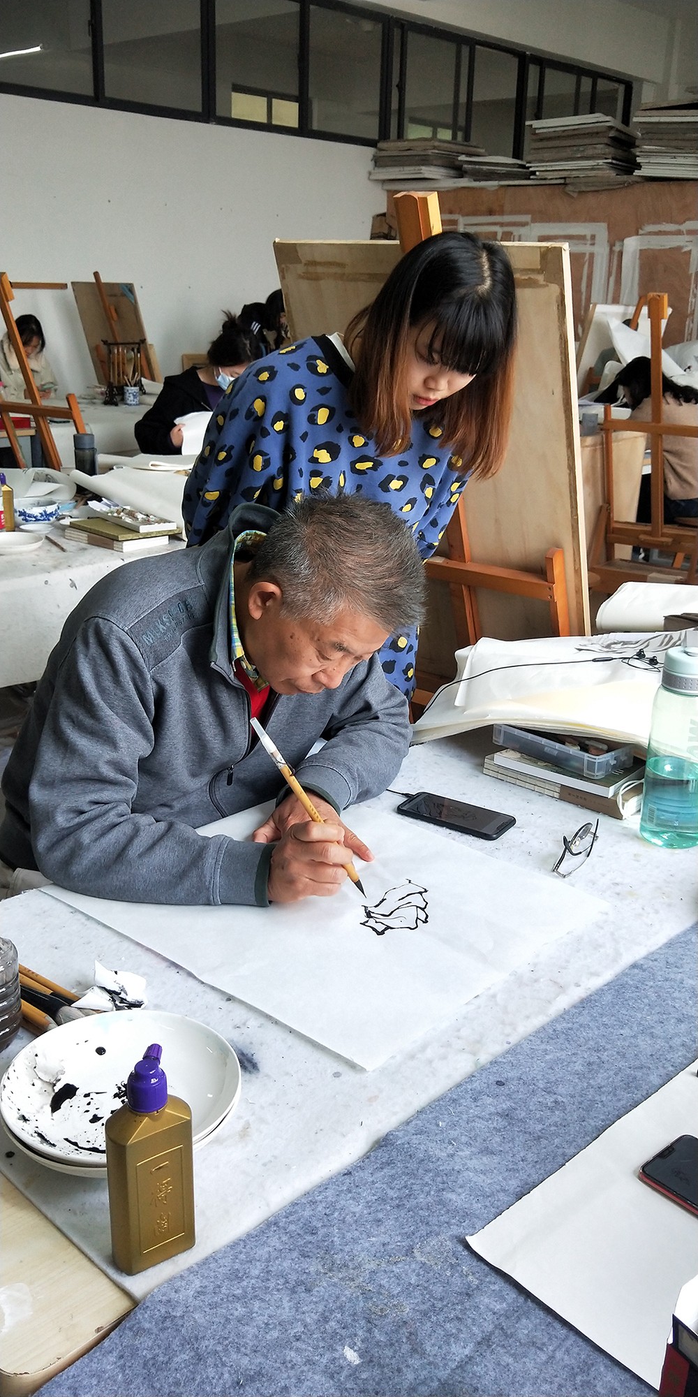 12月初,18级绘画专业中国画方向的《写意人物画》课程有幸请到崔教授授课,课堂上崔教授对写意人物画的历史进行了简要的概述,而后进行实操讲解,对写意人物画的意笔临摹要点进行了详尽的讲解,比如:意笔白描临摹时对于水分的控制,线条的穿插与走向,线条与人物结构之间的关系等,使同学们对写意人物画白描画法有了初步的了解。然后通过示范,一边示范一边讲解,非常直观的将写意人物画的白描表现的方法演示给同学们。