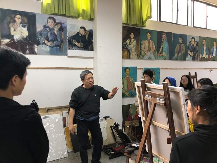 之后,美术学院常务副院长龚为、学工办主任袁志伟及美术学院绘画专业教师陪同计宇教授参观了绘画18级教学区,并进行教学指导。