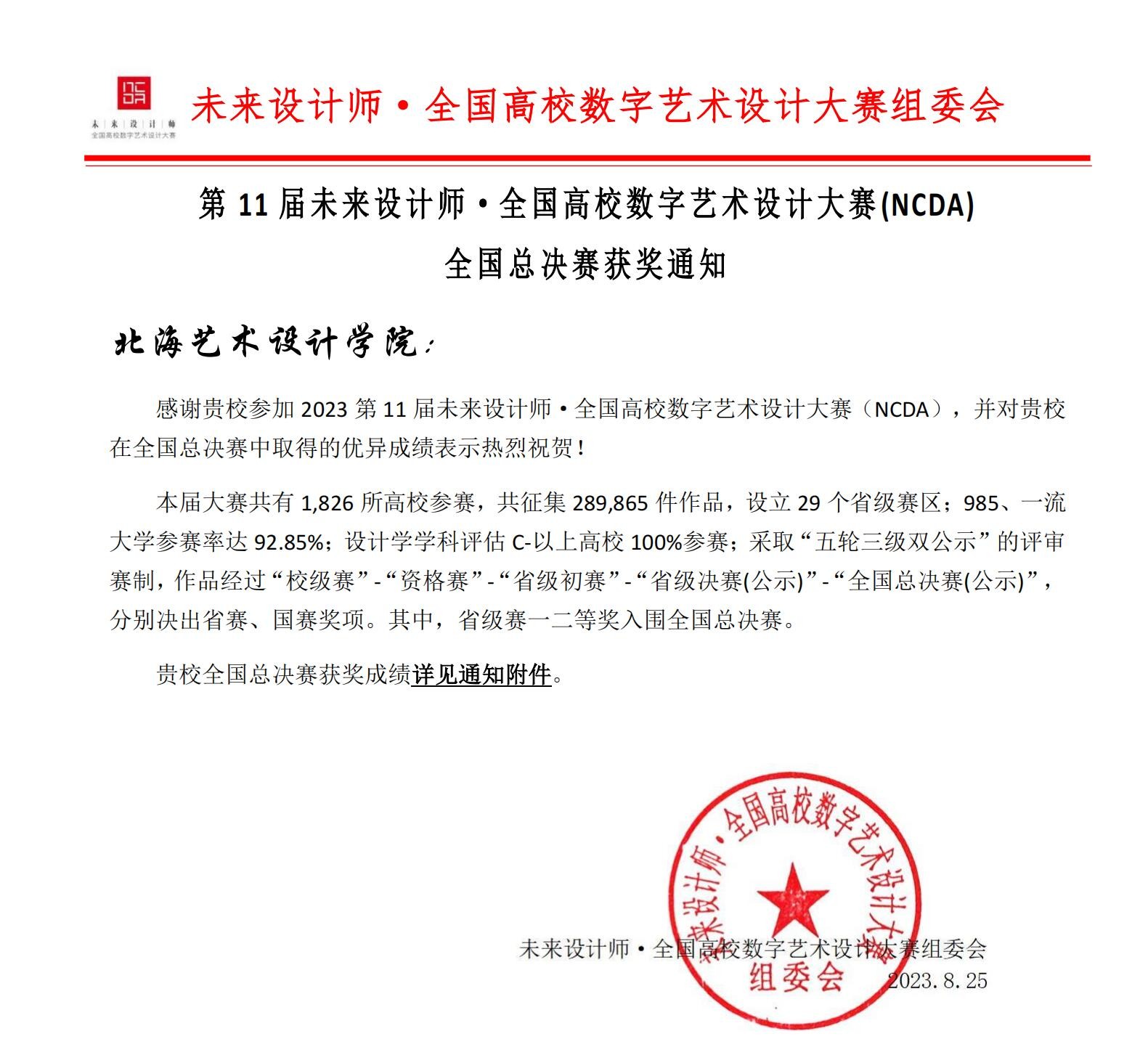 我院师生在2023第11届未来设计师·全国高校数字艺术设计大赛NCDA)中取得优异成绩共荣获全国赛区一等奖2项、二等奖4项、三等奖5项;广西区赛一等奖17项、二等奖20项、三等奖28项,学校荣获省级优秀组织单位”奖