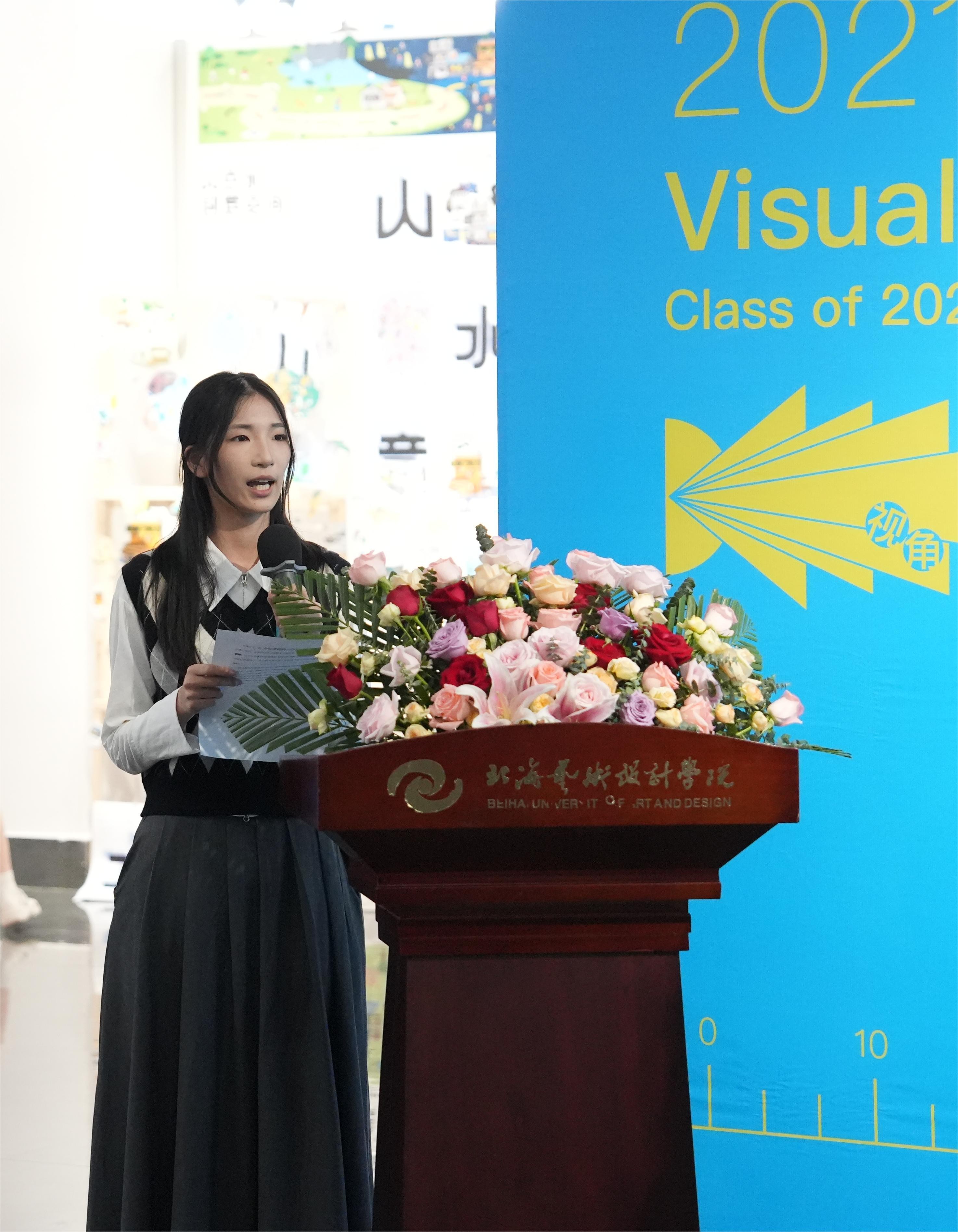 学生代表张涵悦在发言中分享了自己的学习经历和感悟。她回顾了在北海三年的学习时光,表达了对学院和老师的感激之情,并对未来在北京一年的学习充满期待。她表示将继续保持对设计的热爱和追求,不断探索和创新,争取在未来的道路上取得更加优异的成绩。