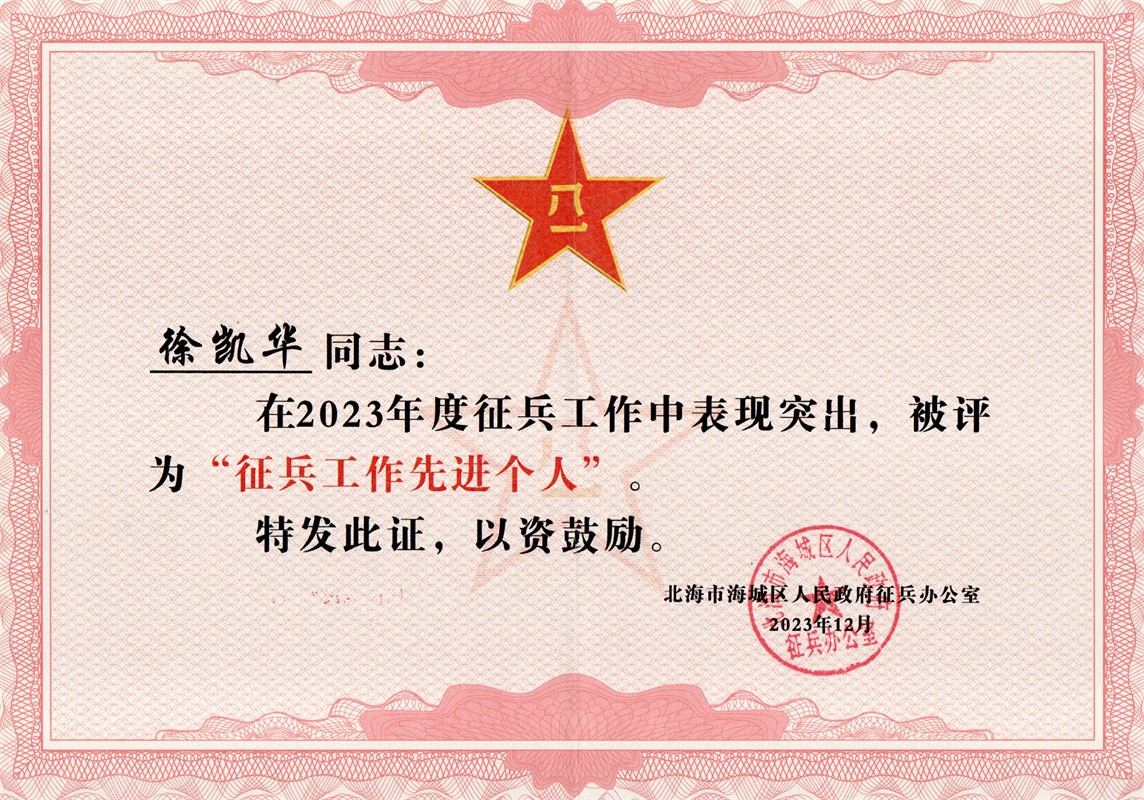 3月14日,北海市海城区人民政府征兵办公室表彰了2023年度海城区征兵工作的先进单位和先进个人,我校教师徐凯华荣获“征兵工作先进个人”称号。这一荣誉的获得,不仅是对徐凯华老师辛勤工作的肯定,更是对我校学生工作处征兵工作的认可。