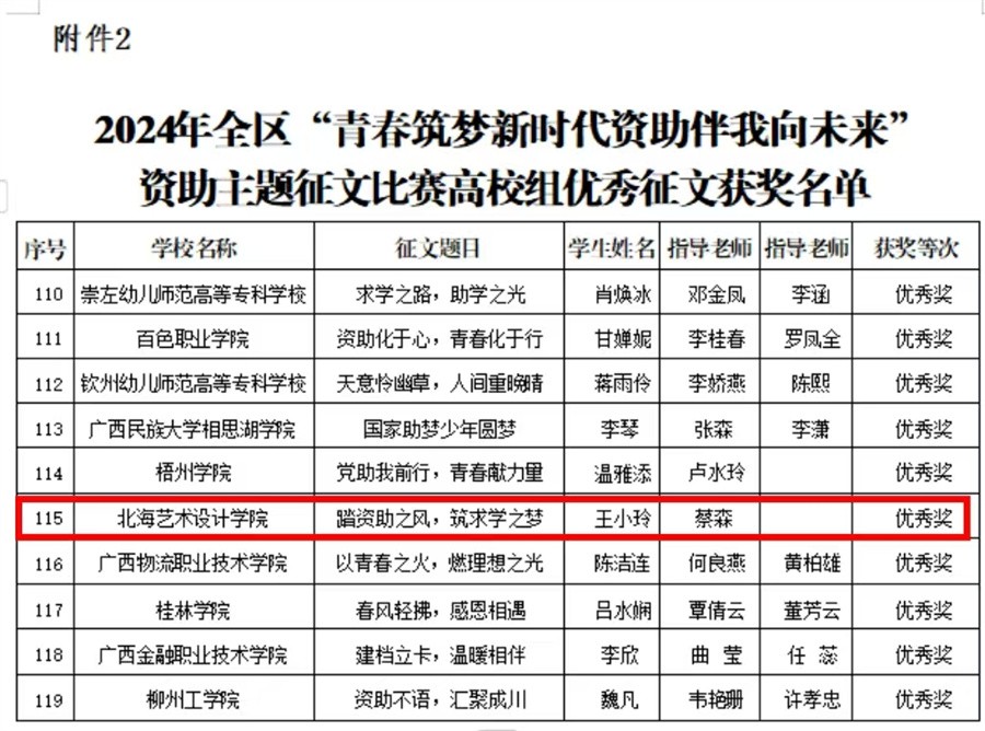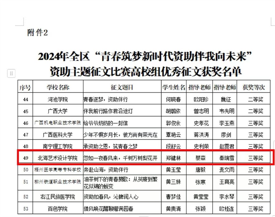 为进一步加大学生资助政策宣传力度,加强对受奖助学生的励志感恩教育,自治区教育厅组织开展了2024年全区“青春筑梦新时代 资助伴我向未来”资助主题征文比赛。我校2名学生在此次征文比赛中喜获佳绩,其中作品《忽如一夜春风来,千树万树梨花开》获三等奖,《踏资助之风,筑求学之梦》获优秀奖。学校教师蔡森、秦瑞雪获得优秀指导老师称号。