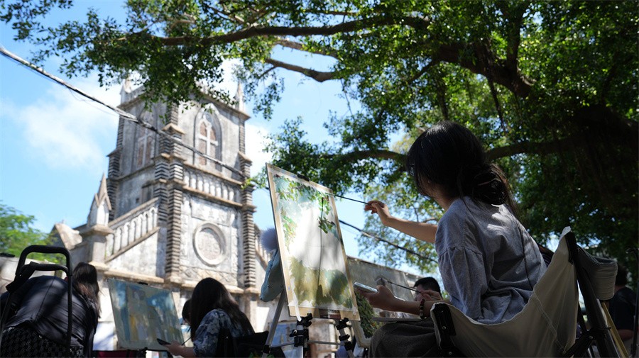 实践期间,学子们的足迹遍布涠洲岛核心文化与自然地标。在红色广场追溯革命记忆,于滴水丹屏定格落日熔金的海洋意境,在天主教堂捕捉百年建筑的光影韵律,于南湾码头记录渔港晨雾的烟火气息,更在鳄鱼山国家火山地质公园描摹火山岩层的独特肌理。通过将文化感知融入专业实践,色彩写生、速写训练与手机摄影成为学生每日的必修课题。他们以多元艺术语言,多角度解读涠洲岛的历史脉络、地理特征与民俗风情,真正实现了“所见即所学,所绘即所思”的教学目标。