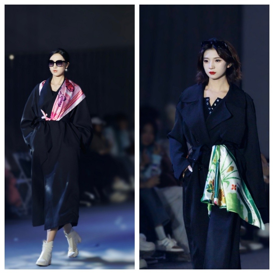 丝巾,既是日常的,又是艺术的;既是轻灵的,又足以承载厚重的叙事。当北艺学子将对校园精神的深刻体悟、对北海人文底蕴的精准理解,融入丝巾设计的经纬与色彩之中,兼具文化内涵与艺术价值。秀场上,模特身着简约日常服饰,以丝巾作为造型核心元素,在简洁搭配中展现多元时尚风格,无需繁复装饰,便让普通穿搭凭借丝巾的点缀焕发生机与独特魅力。