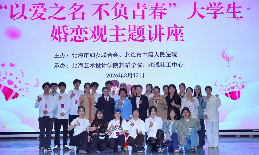 为引导大学生树立健康、理性的婚恋观,构建和谐亲密关系,近日,由北海市妇女联合会、北海市中级人民法院主办,北海艺术设计学院舞蹈学院、和诚社工中心承办的“八桂家教直通车”“五进五送”之“以爱之名不负青春”大学生婚恋观主题讲座和法治进校园志愿服务活动,在我校西校区大礼堂顺利举行。舞蹈学院党支部书记宋慧敏主持讲座。北海市妇联党组成员、副主席、二级调研员余梅,舞蹈学院常务副院长邓欢,北海市妇联家庭和儿童工作部部长王晓峰等领导嘉宾出席活动。