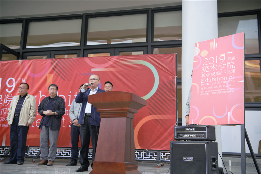 常务副校长贺争平发表讲话,他对美术学院全体师生的共同努力表示赞赏,希望以本次教学成果汇报展为开端,积极开展教学上的改革和探索,砥砺前行,促进美术学院的专业教学再上一个新台阶,祝愿大家在2020年能取得更好的成绩。