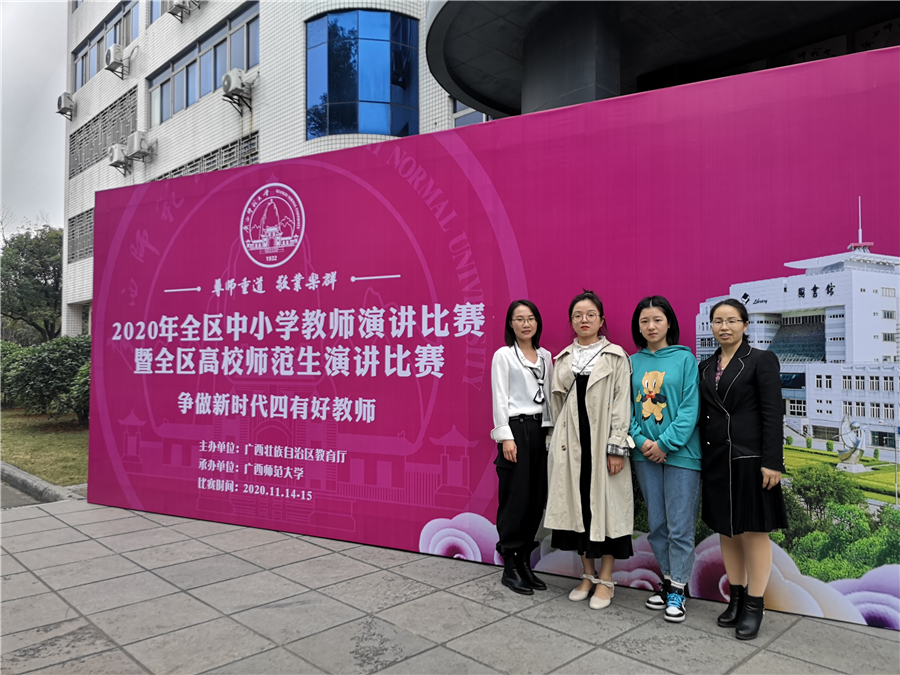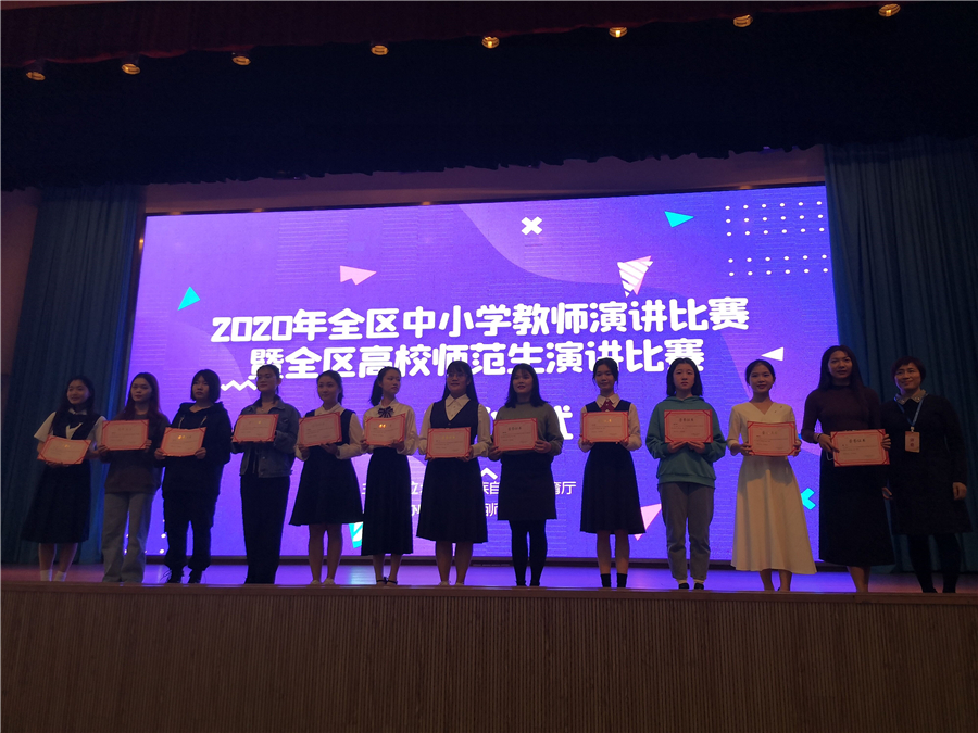 2020年11月14日至15日,由广西壮族自治区教育厅主办的2020年全区中小学教师演讲比赛暨全区高校师范生演讲比赛在广西师范大学举办。来自全区14个地市教育局、33所师范院校遴选出53名教师和79名高校师范生参赛。教育学院推选的学生植霖洁在本次比赛中获得三等奖。